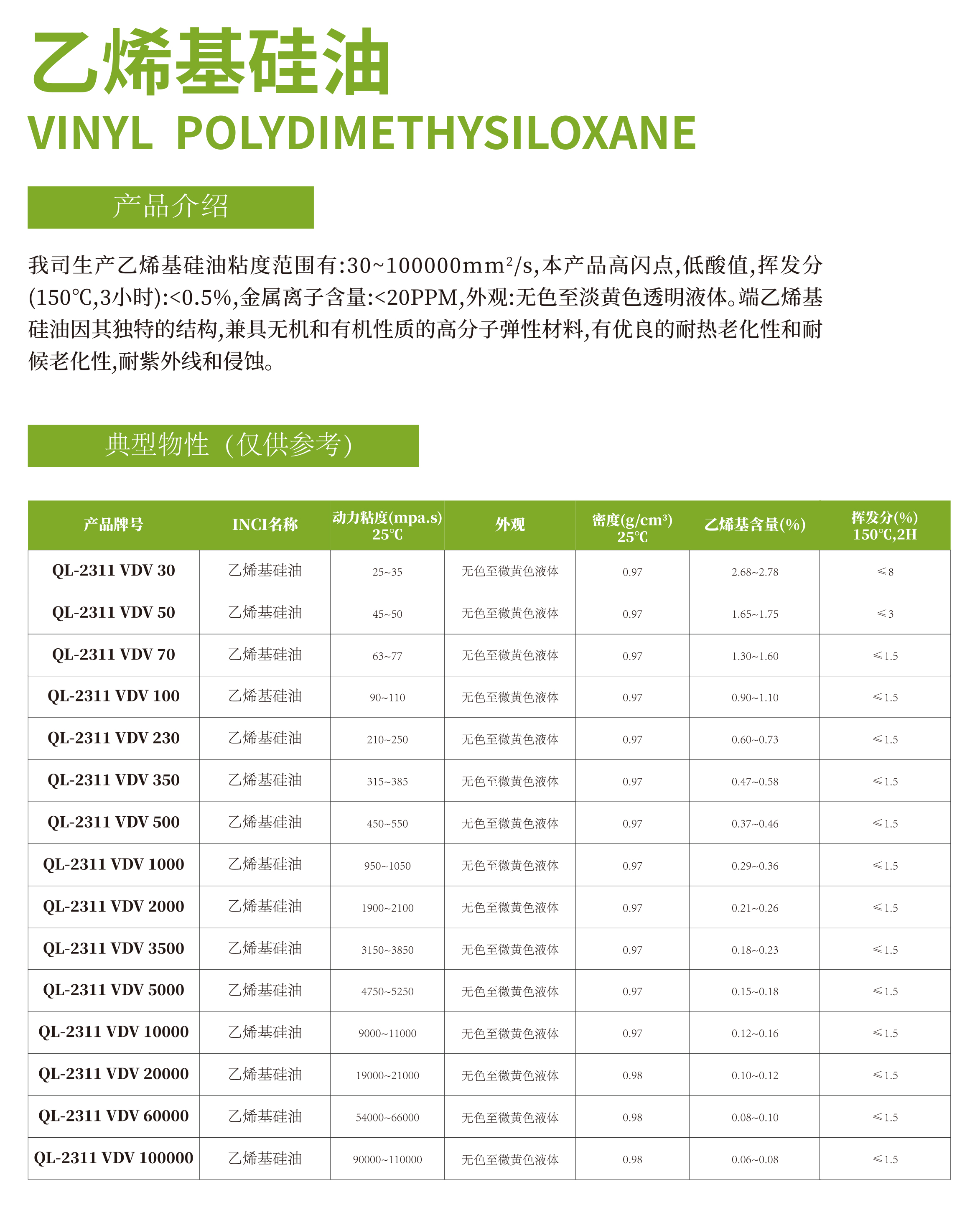 随着电子设备越来越薄、越来越小、越来越快,乙烯基硅油出色的物理特性使得它在新的应用领域可以大展身手:高温及低温稳定性,出色的绝缘性、强度、弹性及韧性,抗湿能力,化学稳定性,抗紫外线及其它环保特性,可以粘合、保护多种材料。